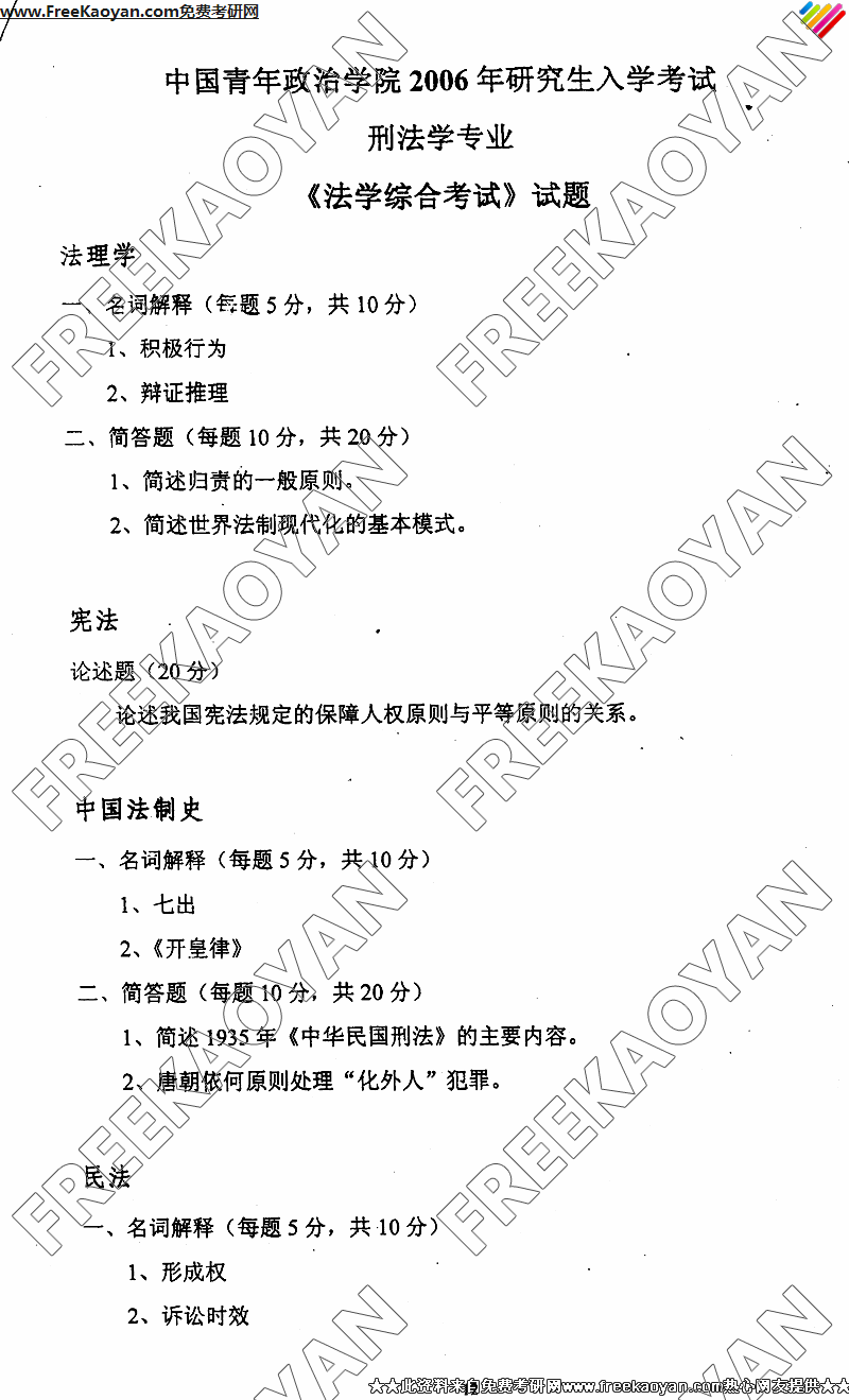 中国青年政治学院2006年考研真题-法学综合考试