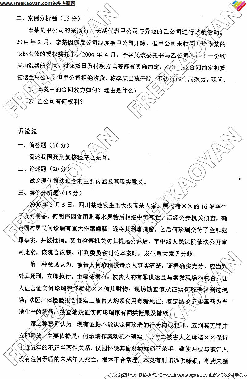 专业课考研经验 本站小编 FreeKaoyan 2018-01-23一、名词解释 1.间接反证 2.无独立请求权第三人 3.暂缓起诉 4.再审不加刑 5.附带民事诉讼 6.强制答辩二、简答 1.辩护人的任务与地位2.刑事二审中的全面审查原则 3.民事强制措施的适用 4.民事诉讼法第219条规定的执行期限的性质三、论述 1.论述死刑复核程序的改革与完善2.论述非讼程序 ...