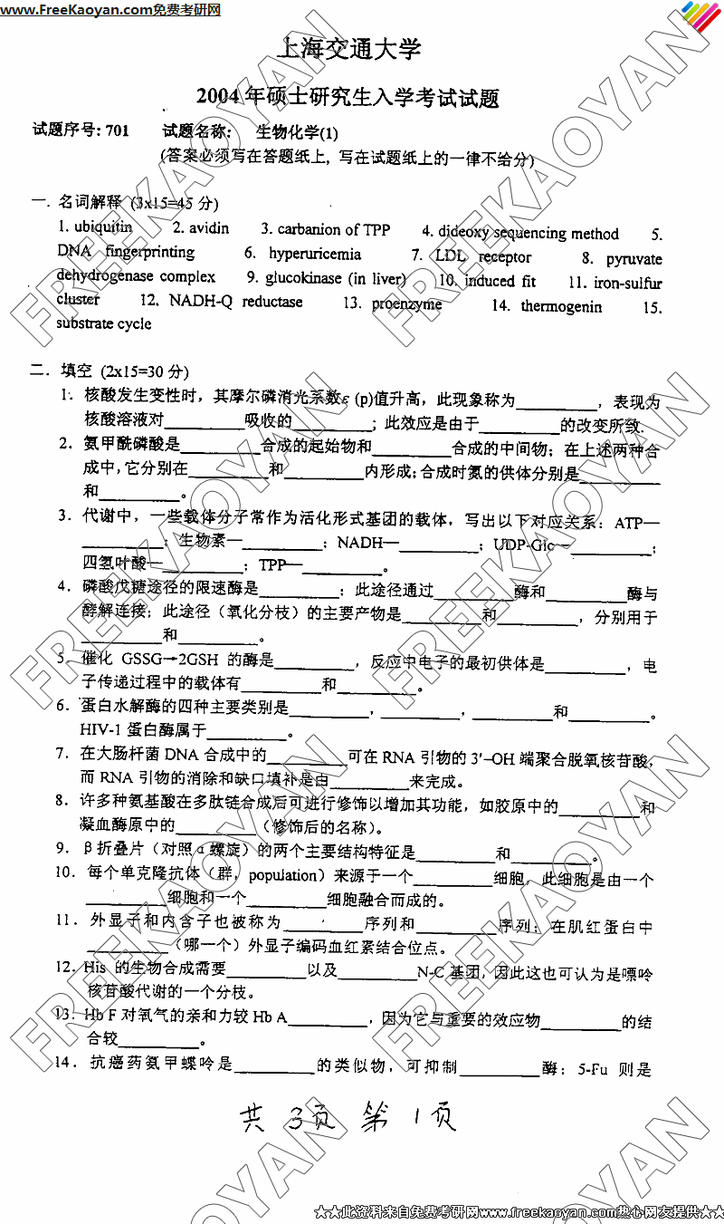 上海交通大学2004年考研真题-生物化学1