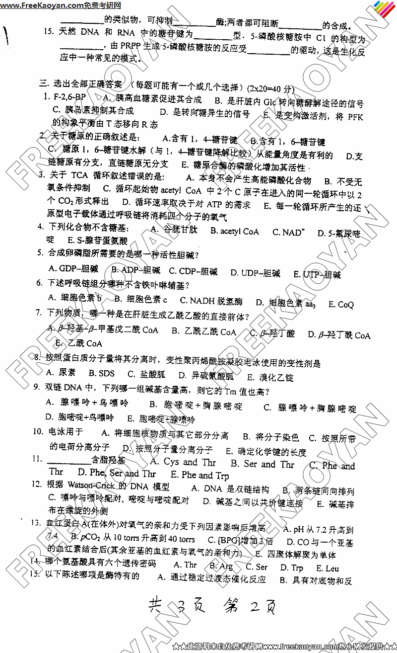 中国农业科学院研究生院2007 年硕士研究生入考试试题 考试科目: 生物化学 考试代码: 402 (注意:考生答题时,答案必须写在答题纸上,写在试题上的一律无效) 本试卷共 3 页, 150 分 一、填空(每空 1 分,共 20 分) 1 :蛋白质超二级结构概念是 1973 年由______提出的: ...