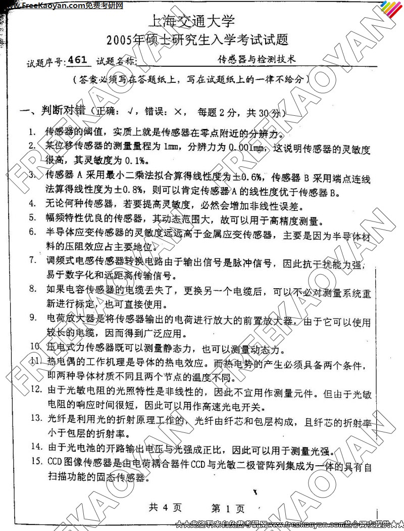 上海交通大学2005年考研真题-传感器与检测技术