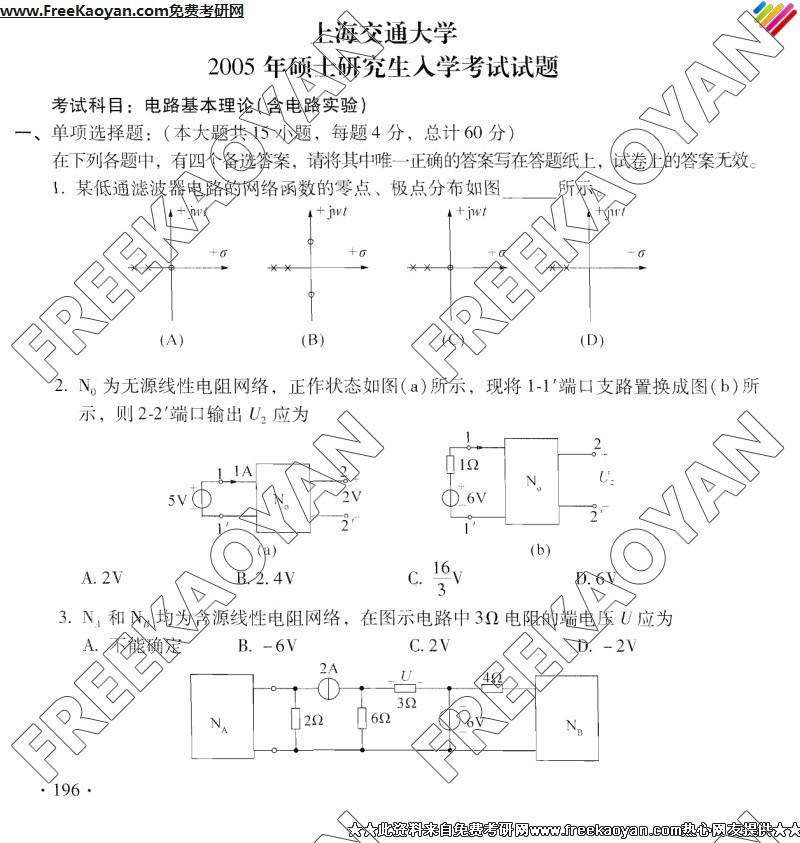 上海交通大学2005年考研真题-电路基本理论(含电路实验)