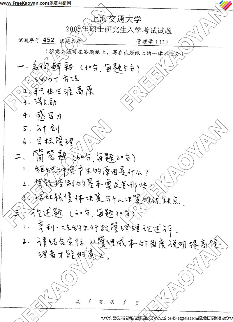 专业课考研经验 本站小编 FreeKaoyan 2018-01-23上海交通大学2005年考研真题-管理学(1)