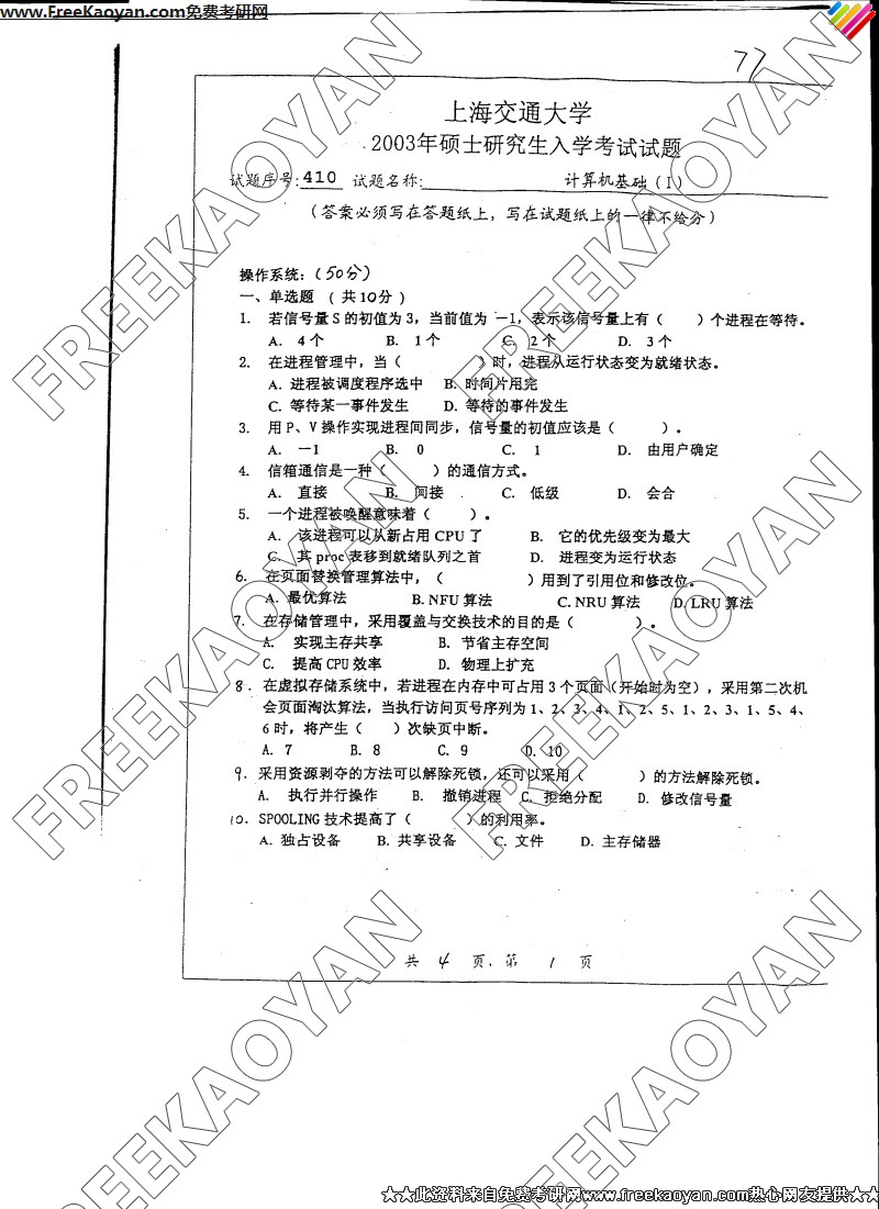 上海交通大学2003年考研真题-计算机基础(I)