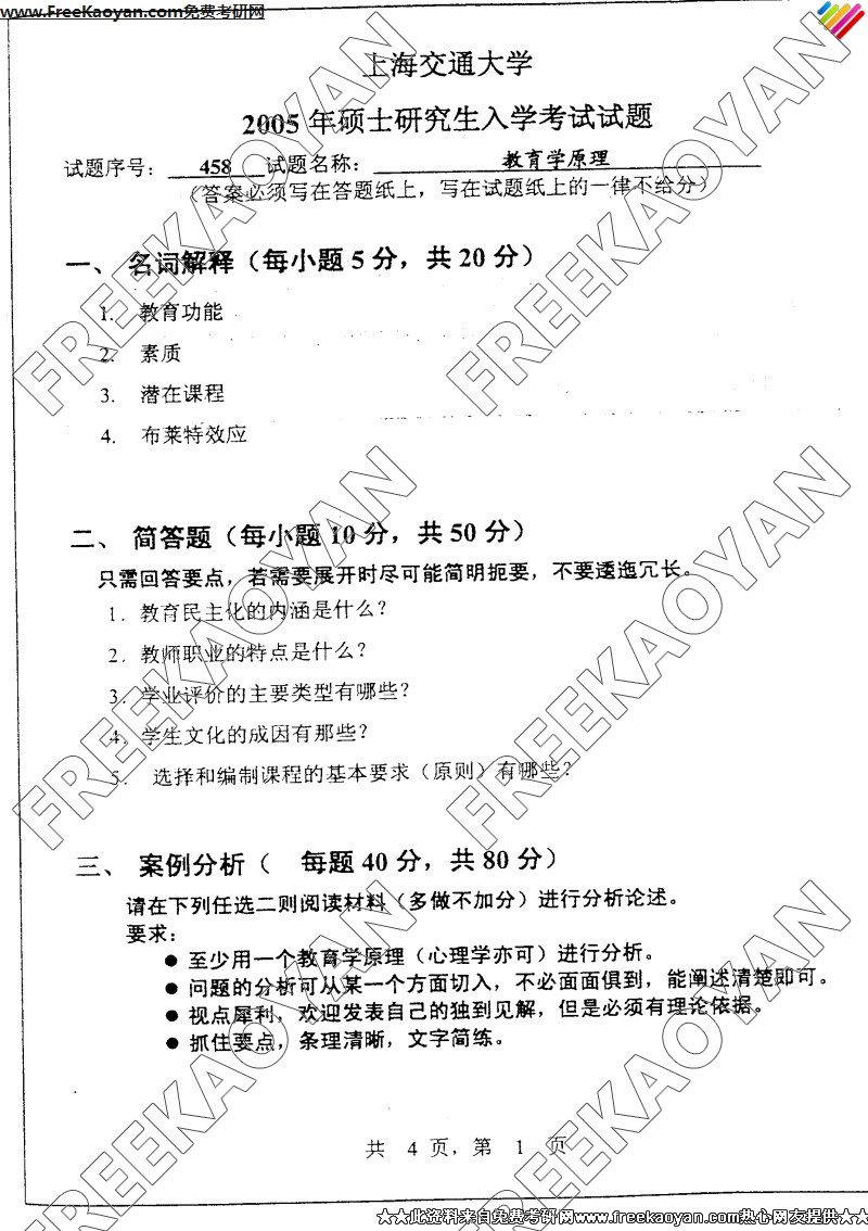 专业课考研经验 本站小编 FreeKaoyan 2018-01-23上海交通大学2005年考研真题-教育技术学与教育心理学