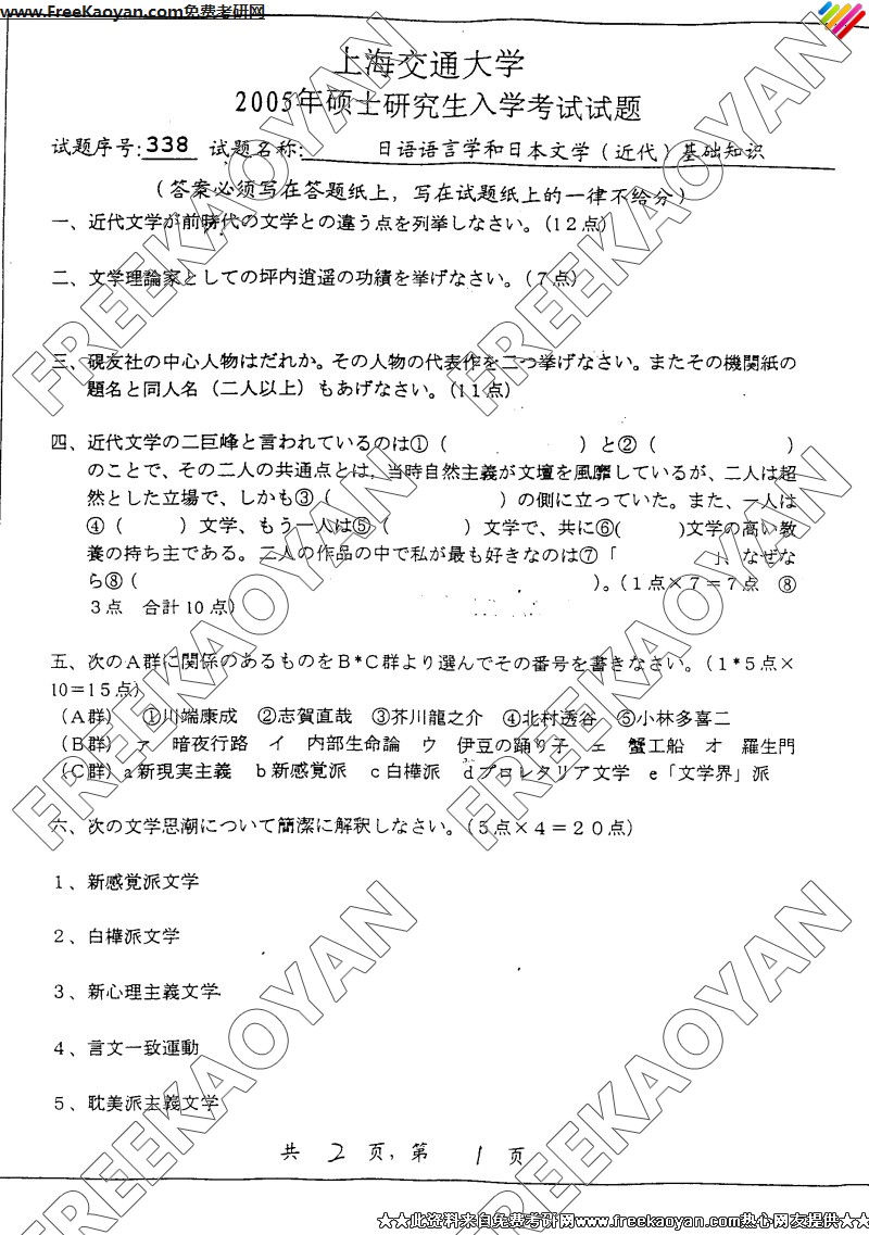 上海交通大学2005年考研真题-日语语言学与日本文学(近代)基础知识