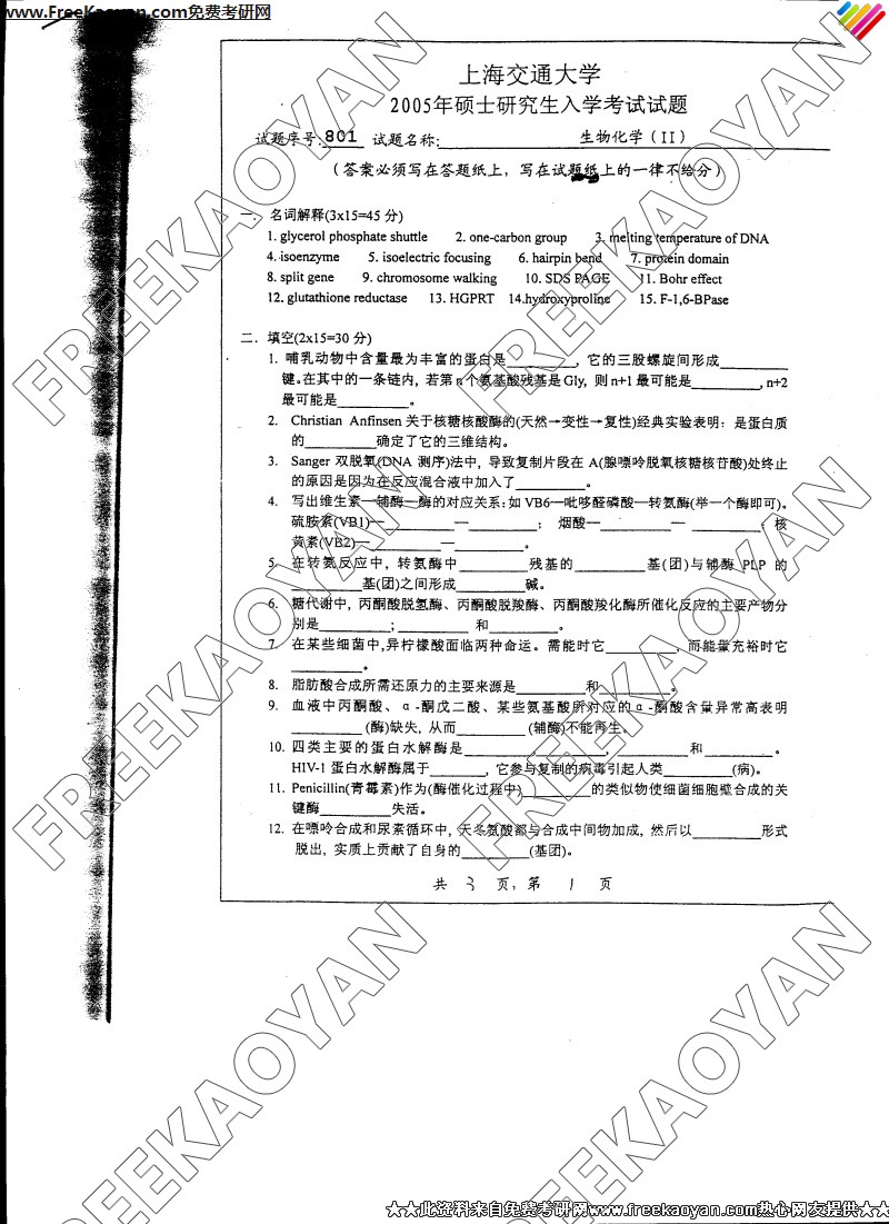 专业课考研经验 本站小编 FreeKaoyan 2018-01-23上海交通大学2005年考研真题-生物化学1
