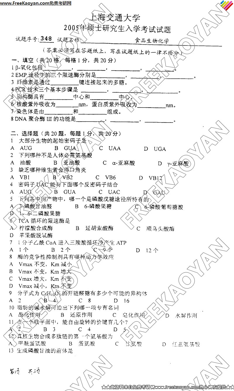 专业课考研经验 本站小编 FreeKaoyan 2018-01-23上海交通大学2005年考研真题-生物化学2