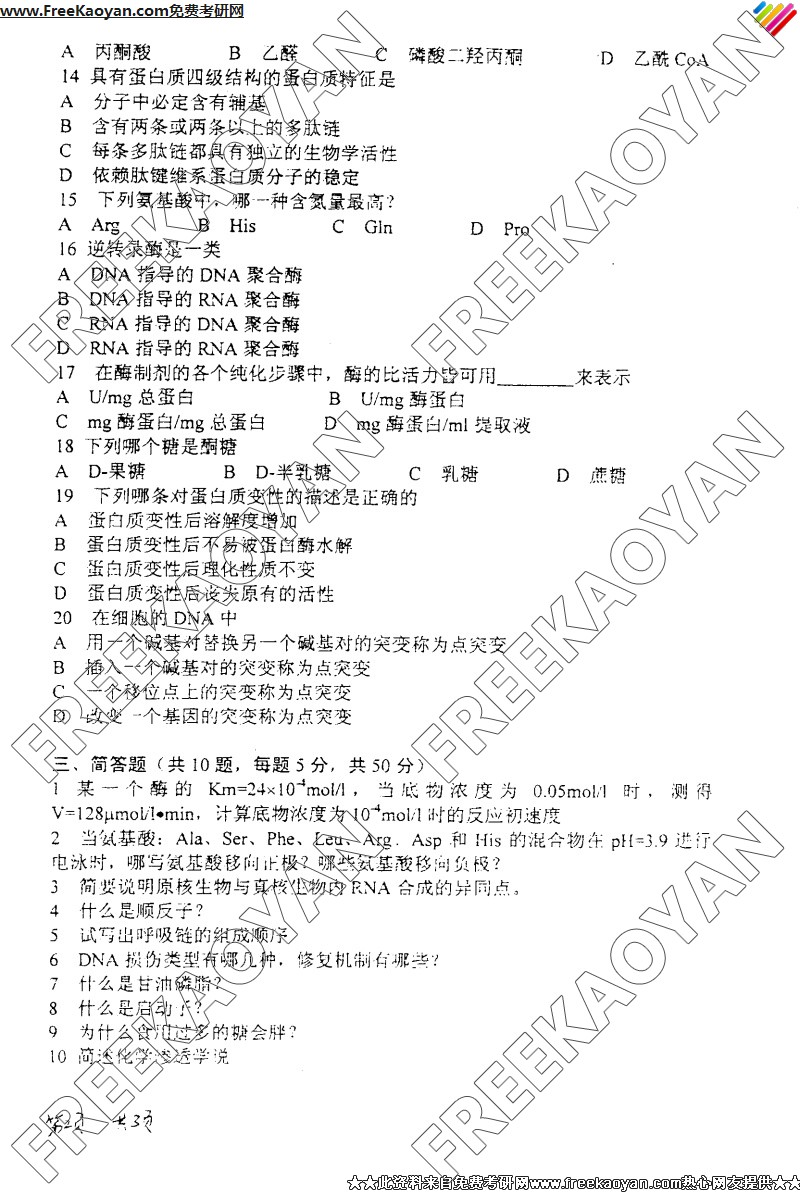 专业课考研经验 本站小编 FreeKaoyan 2018-01-23上海交通大学2005年考研真题-生物化学2