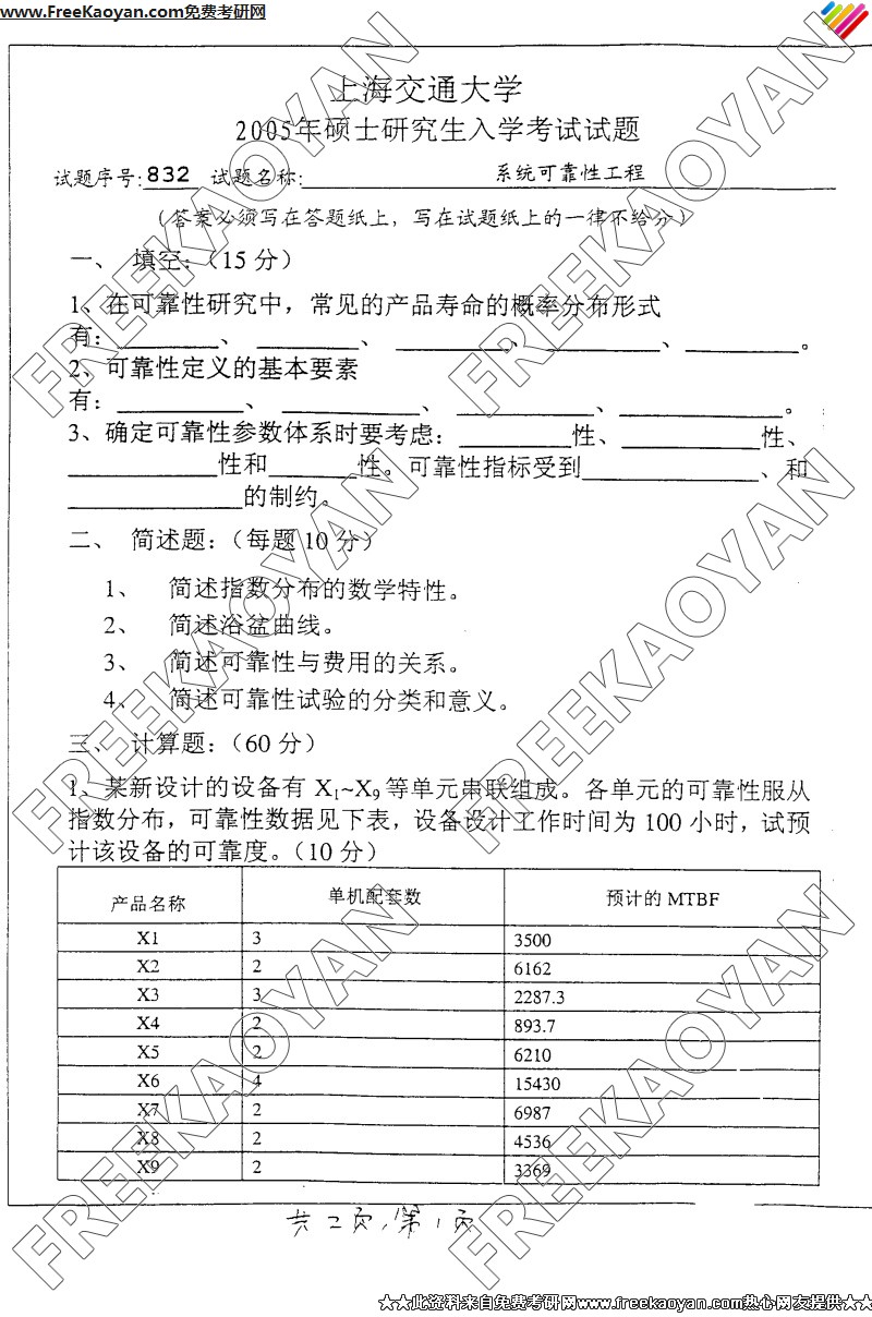 上海交通大学2005年考研真题-系统可靠性工程