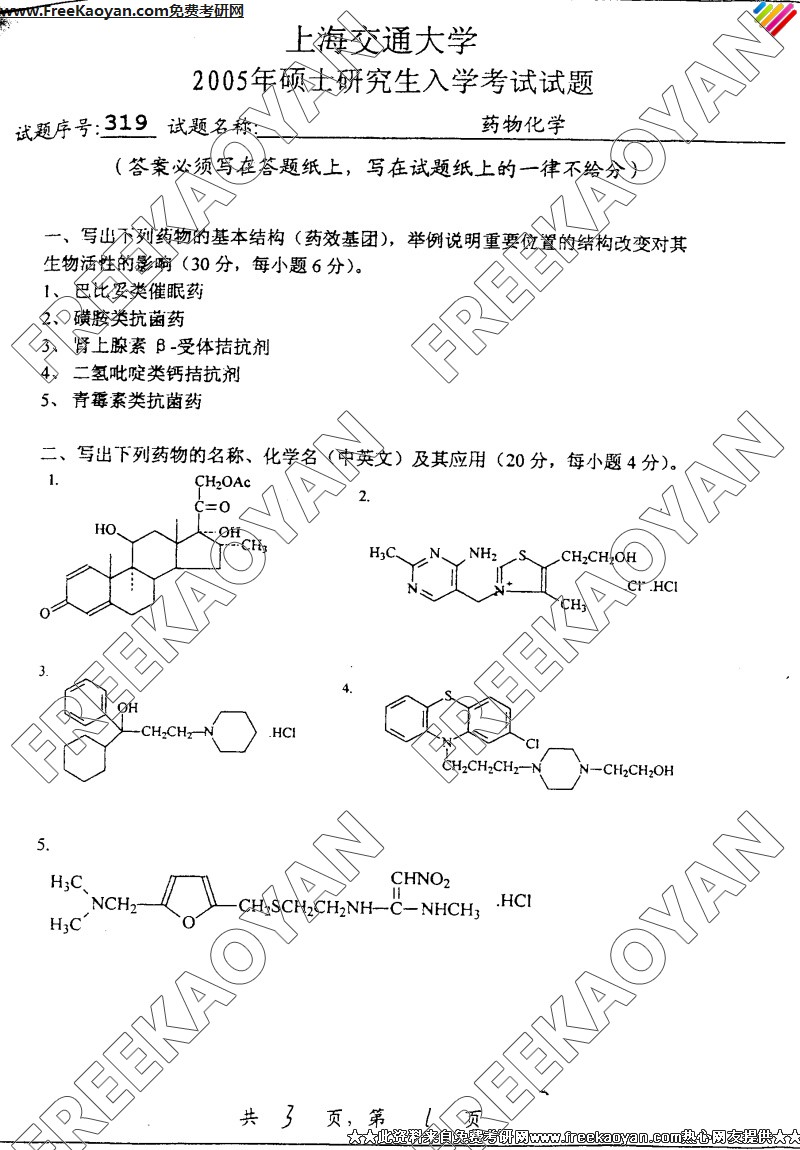 专业课考研经验 本站小编 FreeKaoyan 2018-01-23上海交通大学2005年考研真题-药物分析