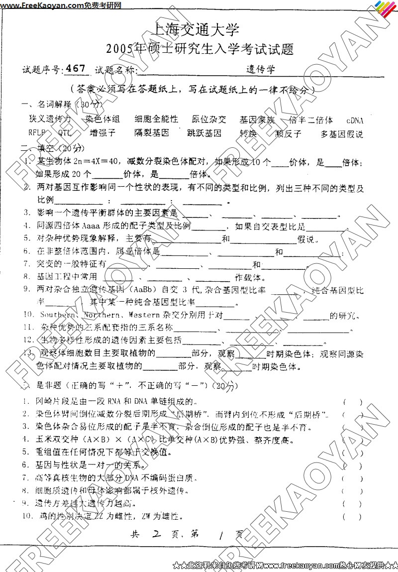 专业课考研经验 本站小编 FreeKaoyan 2018-01-23上海交通大学2005年考研真题-细胞生物学