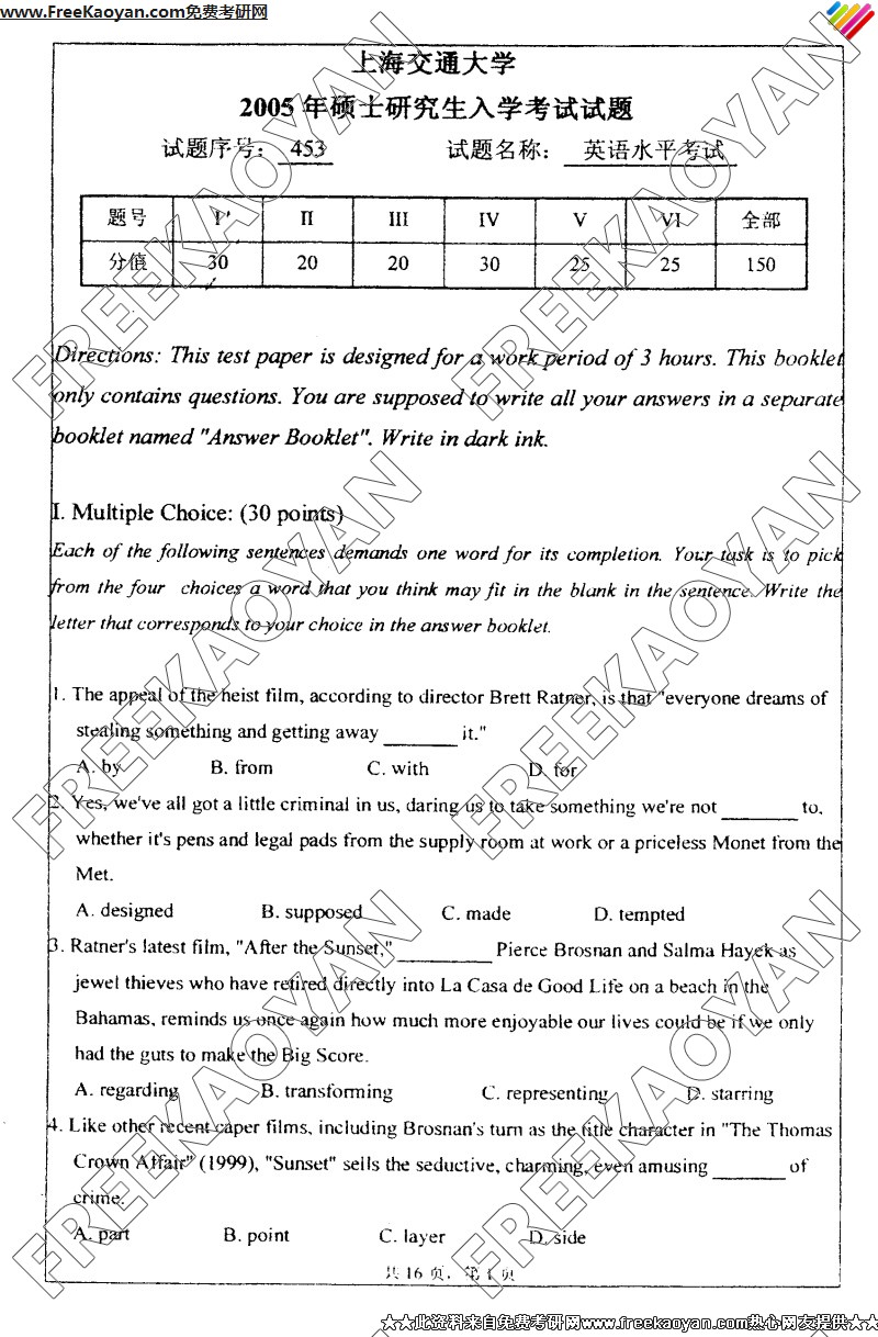 上海交通大学2005年考研真题-英语水平考试