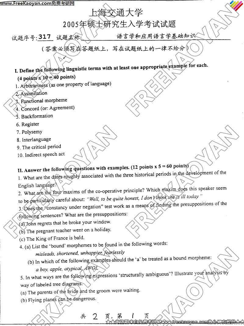 上海交通大学2005年考研真题-语言学和应用语言学基础知识