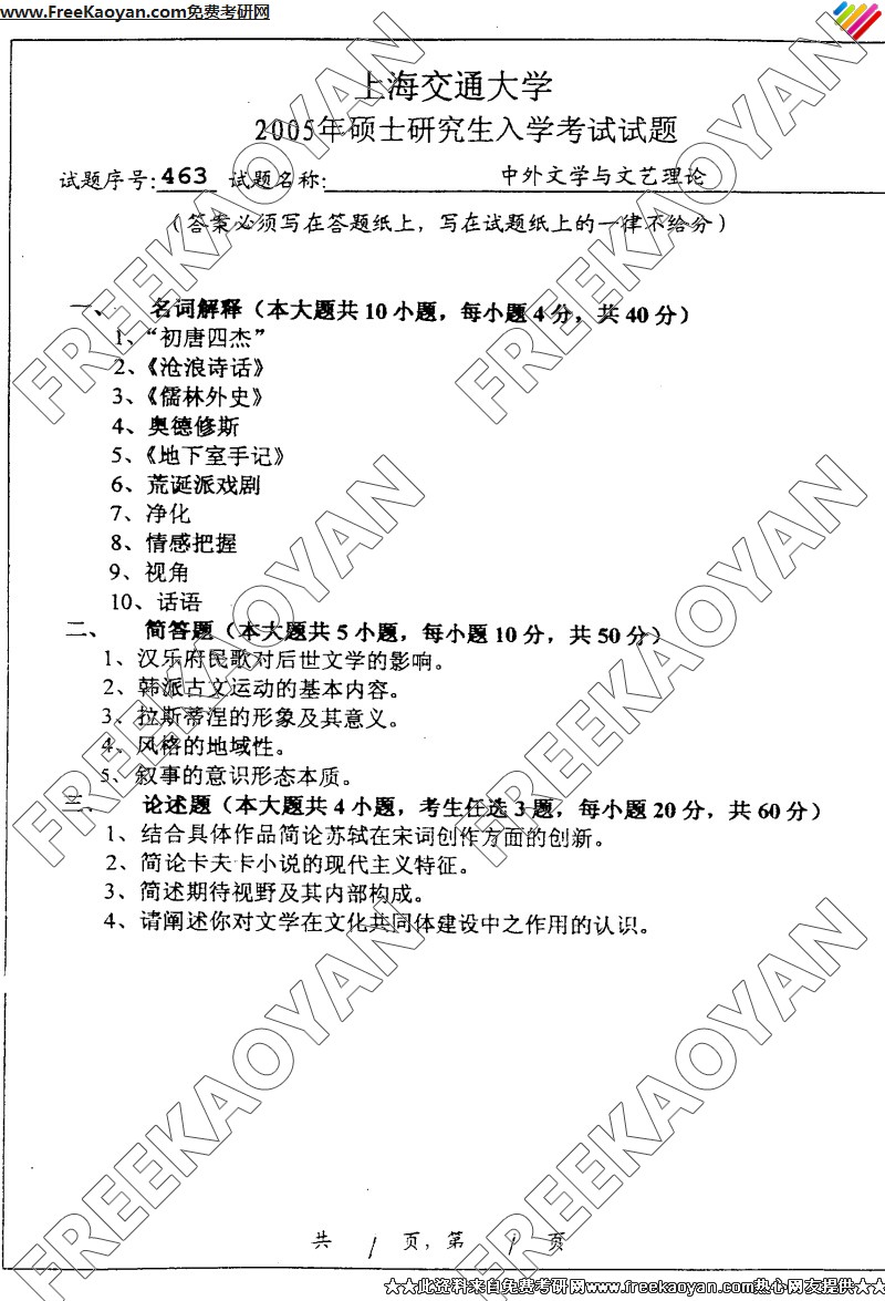 专业课考研经验 本站小编 FreeKaoyan 2018-01-23上海交通大学2005年考研真题-英美文学