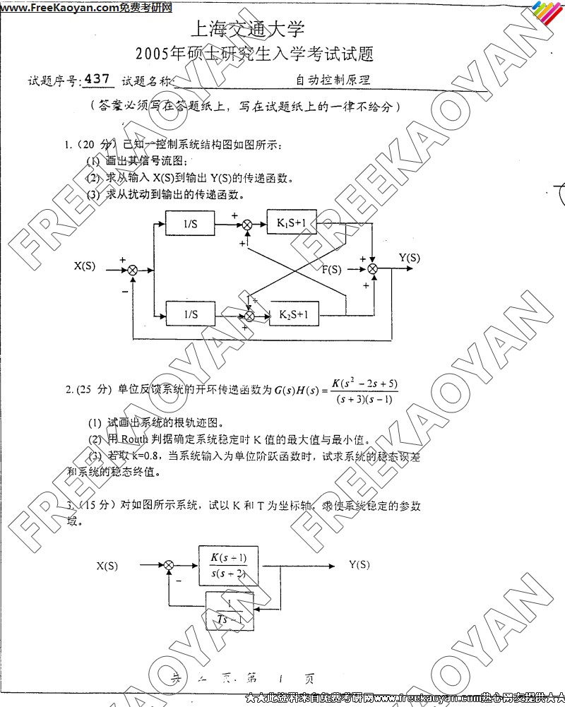 专业课考研经验 本站小编 FreeKaoyan 2018-01-23上海交通大学2005年考研真题-自动控制理论
