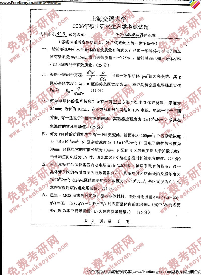 上海交通大学2006年考研真题-半导体物理与器件基础