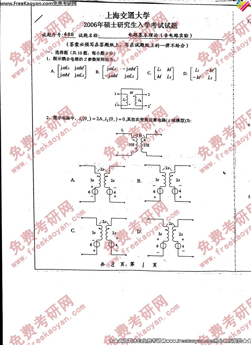 上海交通大学2006年考研真题-电路基本理论(含电路设计)