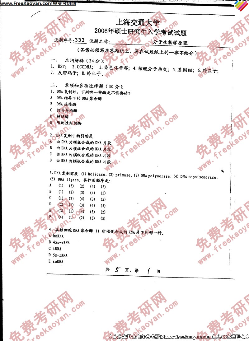 专业课考研经验 本站小编 FreeKaoyan 2018-01-23上海交通大学2006年考研真题-分子生物学