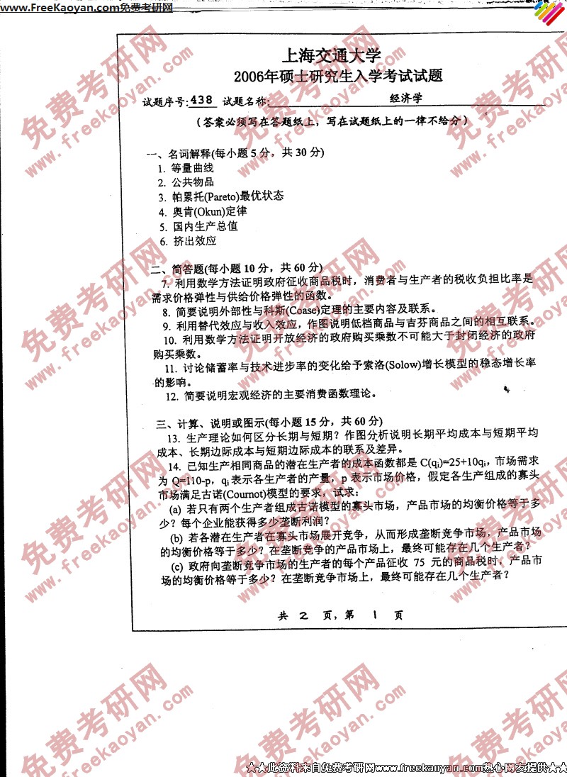 专业课考研经验 本站小编 FreeKaoyan 2018-01-23上海交通大学2006年考研真题-技术经济