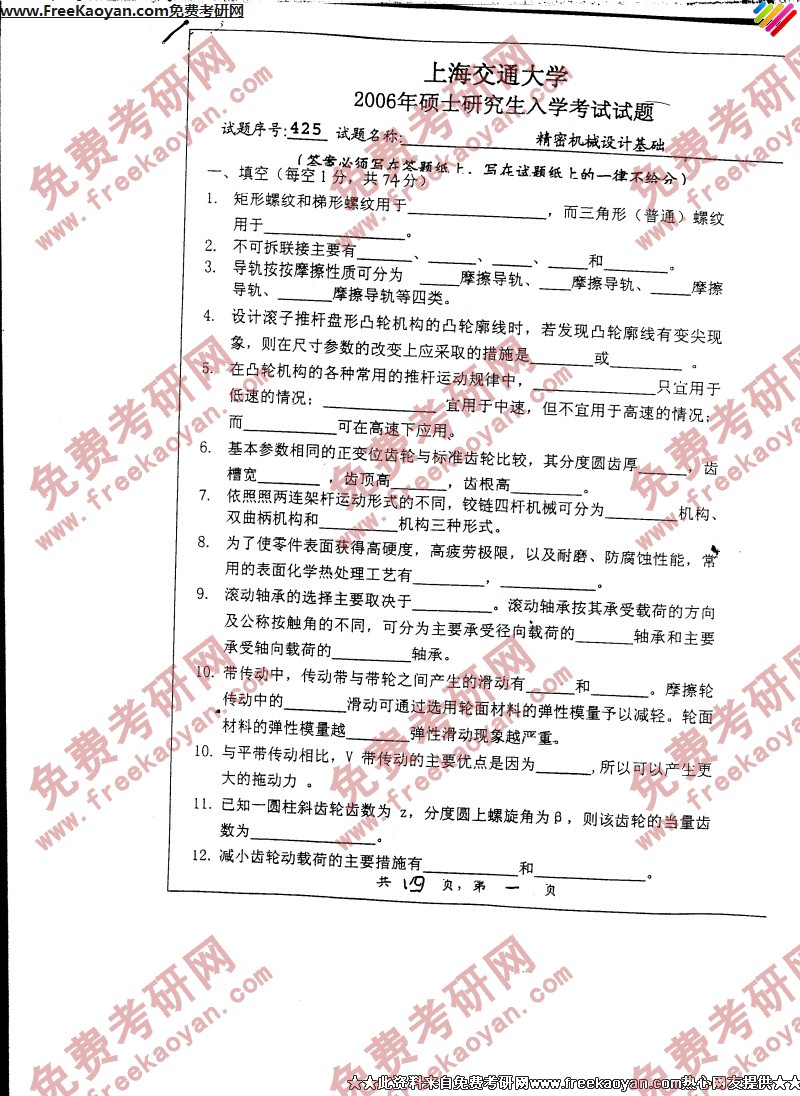 专业课考研经验 本站小编 FreeKaoyan 2018-01-23上海交通大学2006年考研真题-机械设计基础