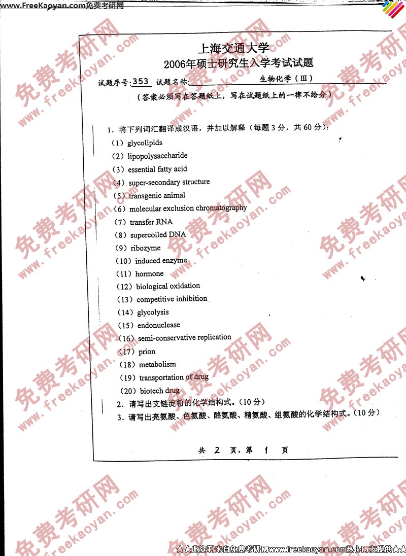 专业课考研经验 本站小编 FreeKaoyan 2018-01-23上海交通大学2006年考研真题-生物化学(I)