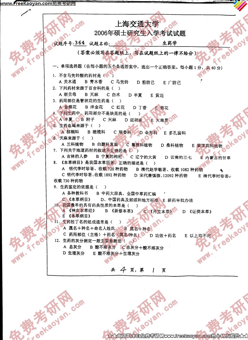 上海交通大学2006年考研真题-生药学