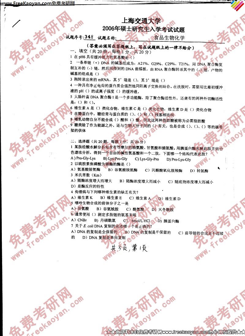 专业课考研经验 本站小编 FreeKaoyan 2018-01-23上海交通大学2006年考研真题-生物化学(I)