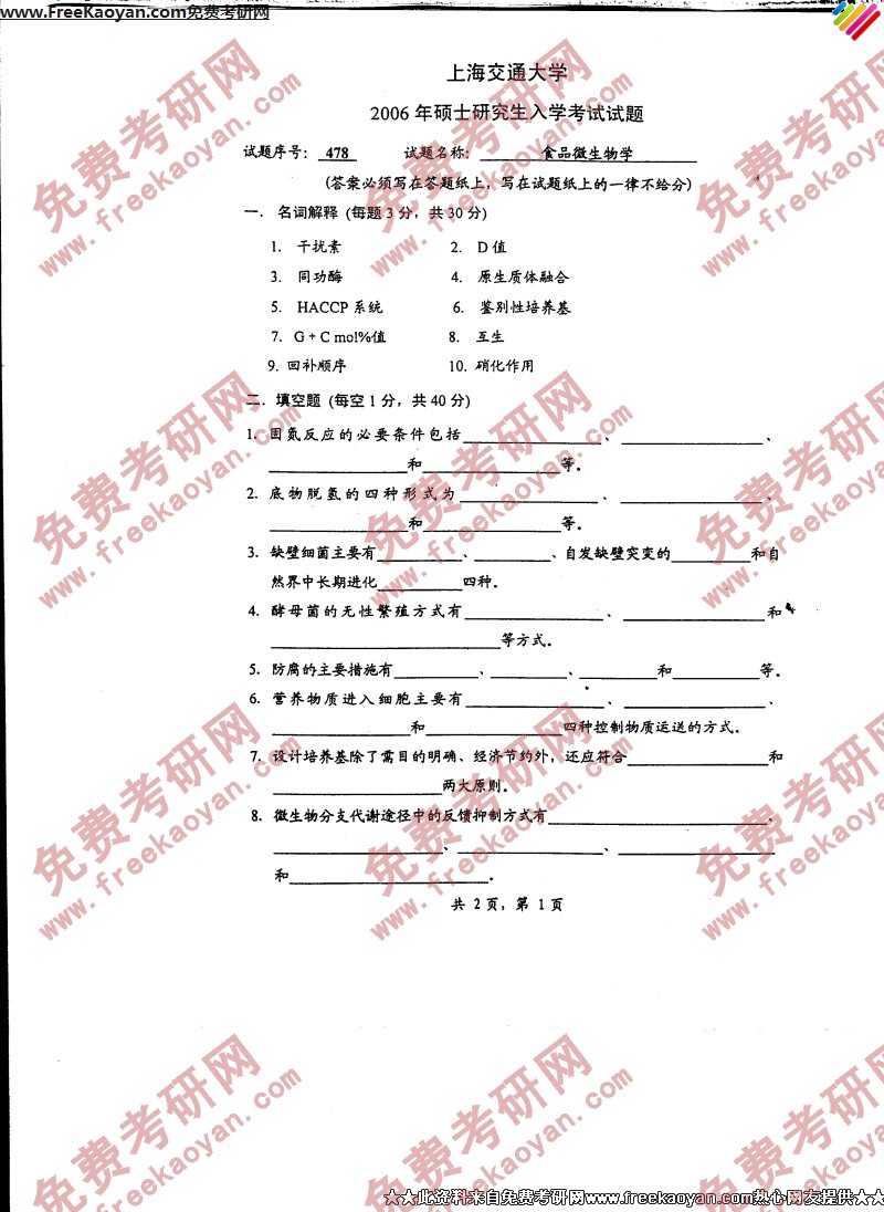 专业课考研经验 本站小编 FreeKaoyan 2018-01-23上海交通大学2006年考研真题-生物综合