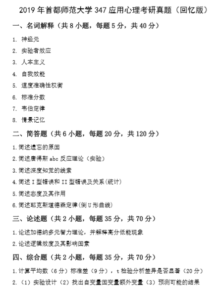 哦对,还有书单变化。确实19年首师大的变化还是挺大的,普心都不用彭聃龄老师那版了,还把测量换成了实验,不过我想20年应该是不会变了吧。对于这一点,大家切勿慌张和抱怨,其实这一点对于20的考生没有太大影响,给哪本咱们就看哪本就好了。这两版普心其实没有特别大的差别,大家就拿上学校指定的这版认真的学习就是了,反正学习方都是一样的。至于实验,其实首师出的题难度也不大,具体的专业课复习下面再详细讲吧。