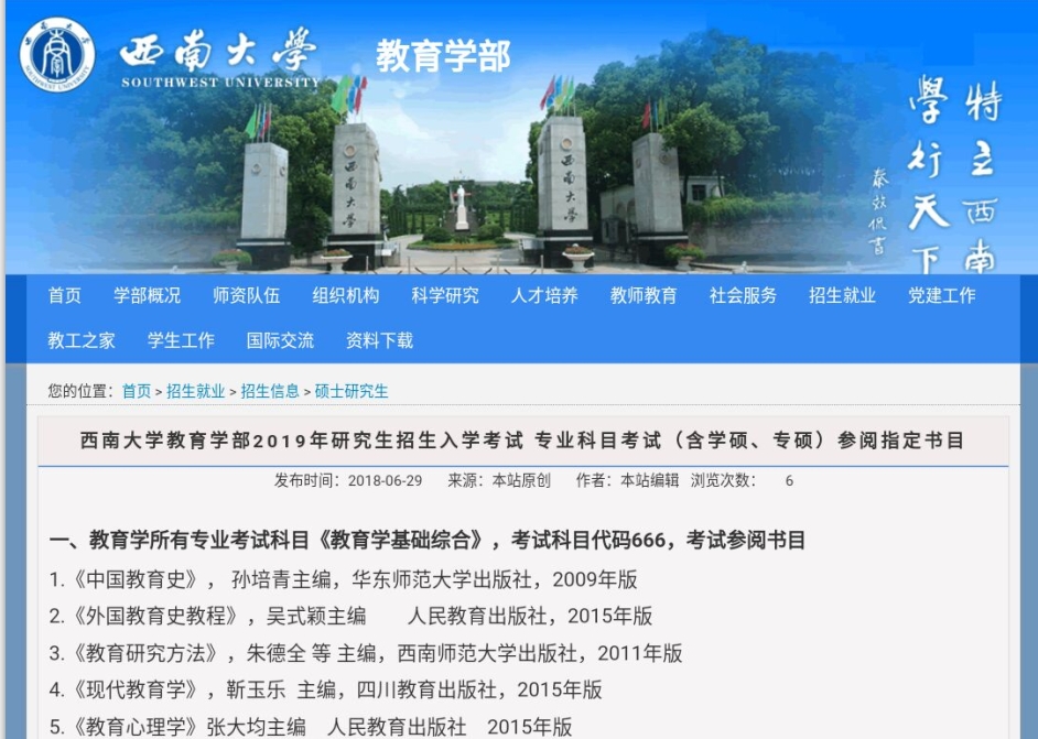 一般说来,基础阶段是在三月份-五月份。其实,如果有想提前开始的小伙伴们,也是可以寒假开始的,寒假在家可以先看看每本书的框架和内容,建议先从《中国教育史》和《外国教育史》这两本书看,这两本书可以帮助尽快入门(如果是像我一样的跨考生)。在看每本书内容之前,先看一下这本书的目录,这样可以帮助小伙伴们在脑子里形成一个框架,不仅对于了解作者的思路很有帮助,而且还有助于后期背诵框架。对于书中的每个知识点都不要放过,西南大学出题是很任性的,任何一个知识点都可能会考到,看书时也要做做笔记,看完之后的总结是很重要的,整理一下知识点,还可以自己画画框架图,帮助记忆框架,这些对于后期的背书都是很有帮助的。特别说明:这个阶段很重要,每个知识点都要理解清楚才可以,要不然在后期会有些吃力。
