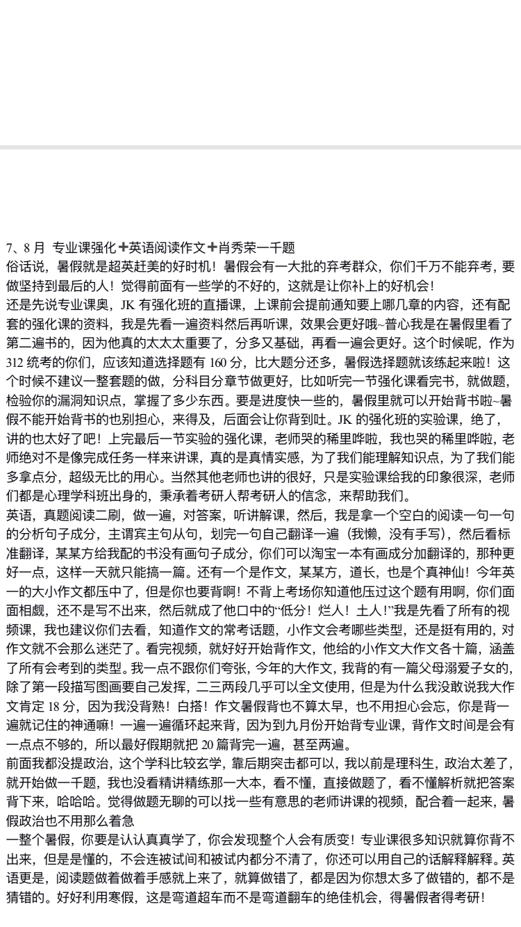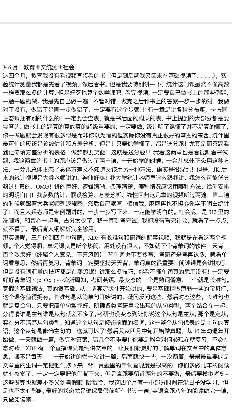 我15号报的班,16号就开始学习了。这个辅导机构在微信公众号上有一个寒假打卡活动,每天复习了什么内容就去打卡,确实是能更好的督促自己学习。我复习的第一本书是普心,建议不管是学硕专硕自命题统考,都先复习普心,普心真的很重要,是一个基础学科,本科也是心理学的宝贝们应该就知道普心要上大一一整年,所以从普心开始就比较好。我是早上八点起床,九点开始学,早上看基础精讲课的视频,就正常倍速看一遍,要是看完就该吃饭了就吃饭,时间还早就背背单词,下午就看书,看了哪一章的视频就看哪一章的书,第一遍看书真的很慢很慢,又很枯燥,但是一定要坚持,书本才是最重要的。我大概是看了半个月吧,然后也没几天就过年了,我又开开心心的过了个年,应该到2月10号左右吧,才接着学习,一本发展我就看到了月底。英语我是报的某方的课,寒假里有一个基础词汇和基础语法的直播课,都是在晚上,我就跟着听课,单词有一天没一天的背。