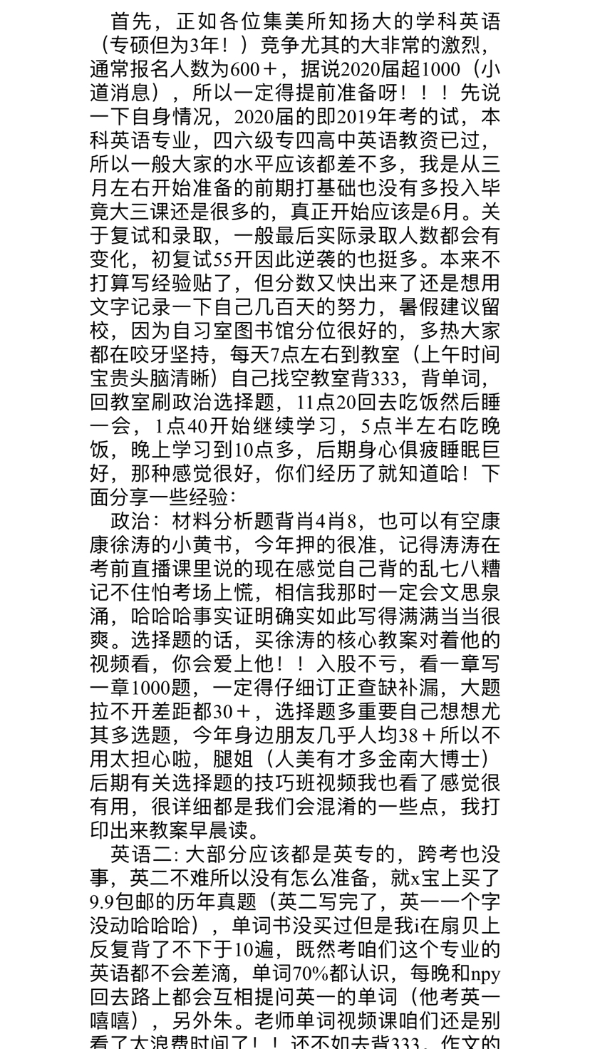 作者: 雁徊 时间: 2020-1-23 09:40 标题: 三跨、四战古代文学之扬州大学 第七段开始正式涉及考题,如赶时间的朋友可跳过前面六段,直接从第七段开始看。(此为第一段始计) 这一次是我第四次参加考试。尽管如此,但从准备情况和学习状态来说,这其实应该是第一次就应具备的。前三次分别是南师、南师、重师,虽买了真题 ...专业课考研经验 本站小编 考研帮 2020-01-24