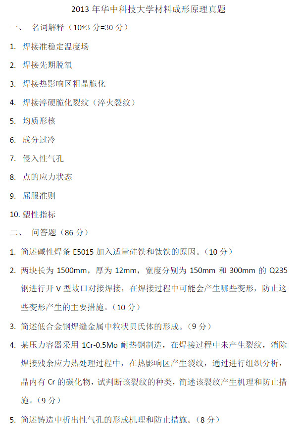 一、 名词解释(10*3分=30分) 1. 焊接准稳定温度场 2. 焊接先期脱氧 3. 焊接热影响区粗晶脆化 4. 焊接淬硬脆化裂纹(淬火裂纹) 5. 均质形核 6. 成分过冷 7. 侵入性气孔 8. 点的应力状态 9. 屈服准则 10. 塑性指标