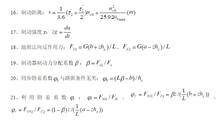 第一章 汽车的动力性 1.汽车动力性指标:最高车速、加速时间、最大爬坡度 2.加速时间表示加速能力:原地起步加速时间和超车加速时间 3.驱动力:地面驱动轮的反作用力Ft=Tt/r=TtqigioT/r 4.驱动轮的转矩: Tt= TtqigioT 5.发动机转矩特性:节气门全开,发动机外特性曲线;节气门部分开启,部分负荷特性。 6.功率:Pe=Ttq n/9550 7.使用外特性曲线:带上全部设备时的发动机特性曲线 8.传动系功率损失:机械和液力损失 9.自由半径:车轮处于无载时的半径 10.静力半径Rs:汽车静止时,车轮中心至轮胎与道路接触面间的距离 11.滚动半径rr:车轮几何中心到速度瞬心的距离。 12.驱动力图:根据下列两个公式:Ua=0.377nr/igio Ft=Tt/ ...