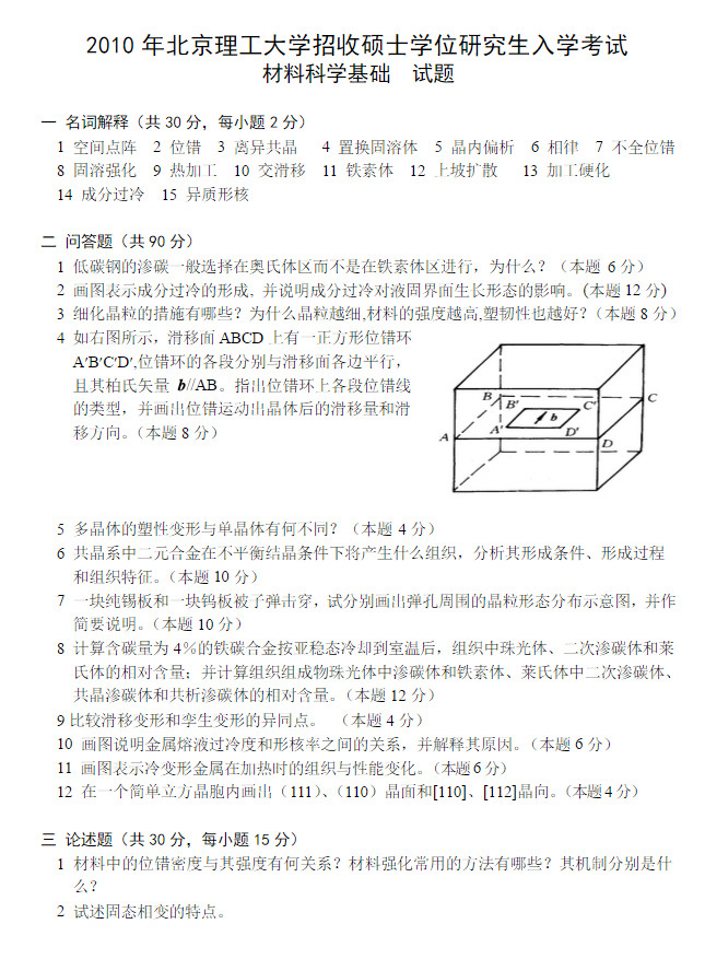 1 低碳钢的渗碳一般选择在奥氏体区而不是在铁素体区进行,为什么?(本题6分) 2 画图表示成分过冷的形成, 并说明成分过冷对液固界面生长形态的影响。(本题12分) 3 细化晶粒的措施有哪些?为什么晶粒越细,材料的强度越高,塑韧性也越好?(本题8分) 4 如右图所示,滑移面ABCD上有一正方形位错环