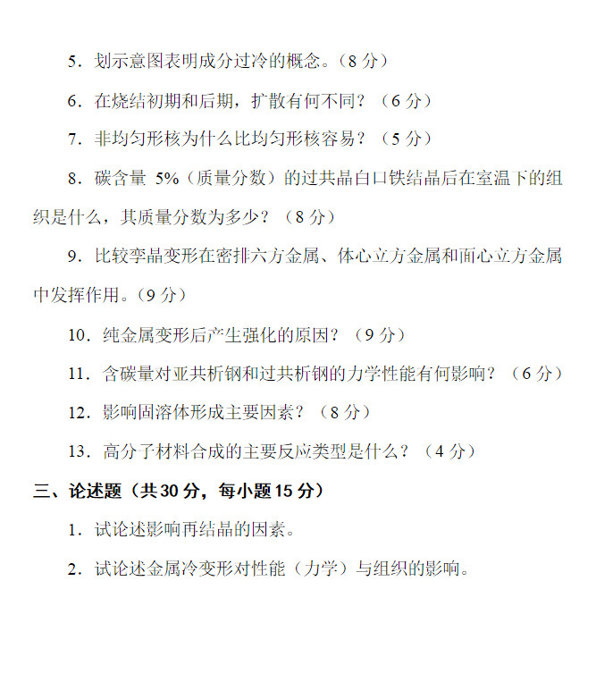 2010年北京理工大学招收硕士学位研究生入学考试 材料科学基础 试题 一 名词解释(共30分,每小题2分) 1 空间点阵 2 位错 3 离异共晶 4 置换固溶体 5 晶内偏析 6 相律 7 不全位错 8 固溶强化 9 热加工 10 交滑移 11 铁素体 12 上坡扩散 13 加工硬化 14 成分过冷 15 异质形核 二 问答题( ...