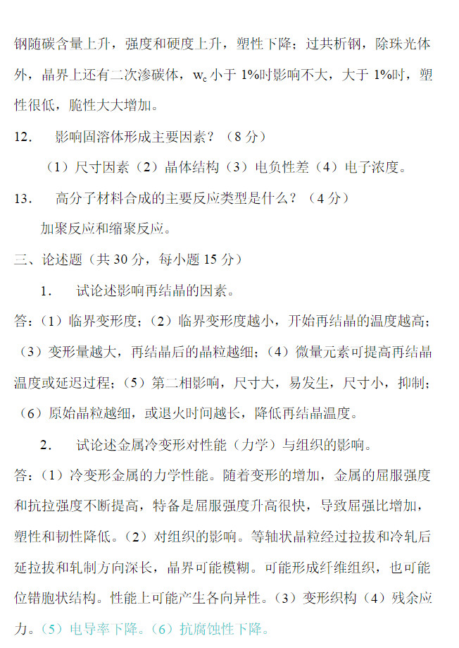 2012年北京理工大学招收硕士研究生入学考试试题 材料科学基础 一、 名词解释(共30分,每小题2分) 1 变形强化 2等轴晶 3晶胞 4弗兰克尔(Frenkel)缺陷 5 攀移 6晶内吸附 7晶内偏析 8 伪共晶 9 共晶渗碳体 10 自然时效 11 孪晶变形 12 二次再结晶 13抗磁体 14 蠕变 15胞状偏析 二、简答题(共90分) 1. 烧结时的速 ...