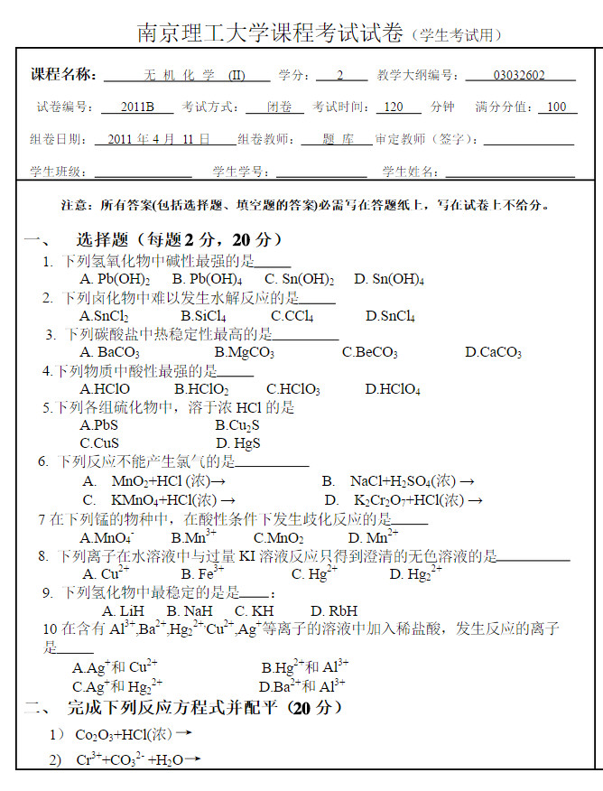 考研报考信息 本站小编 免费考研网 2015-04-20无机化学期末复习大纲