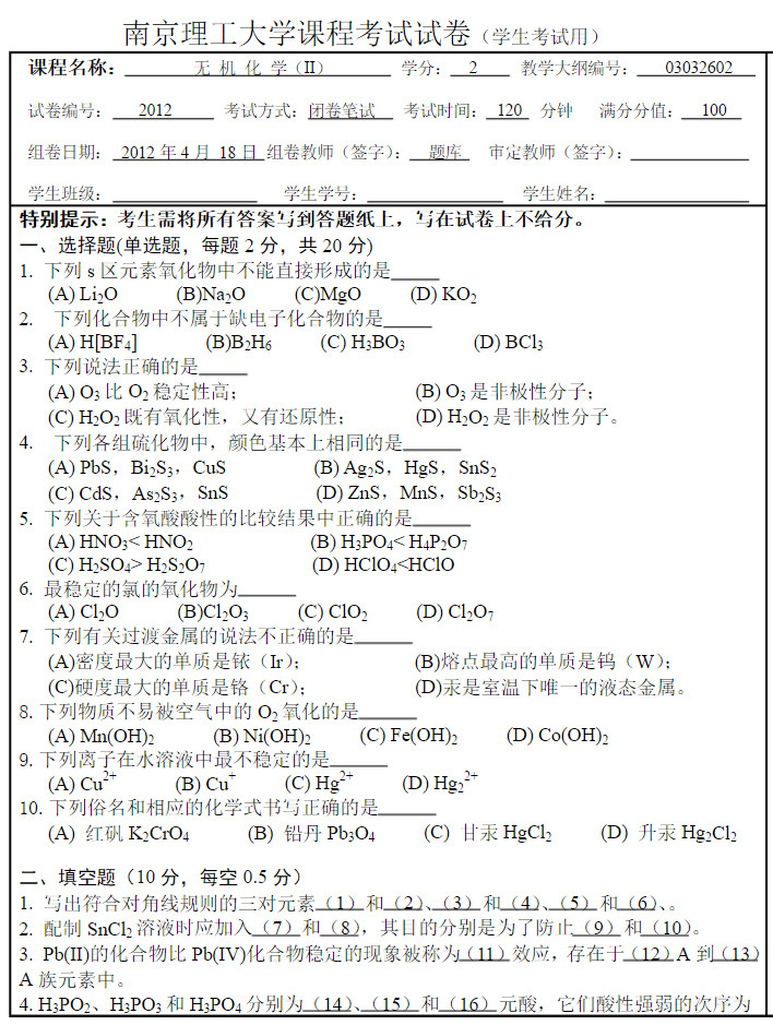 南京理工大学无机化学(第2学期)2012B期末考试试卷