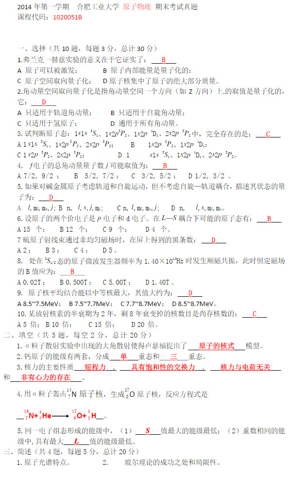 014年第一学期 合肥工业大学 原子物理 期末考试真题 课程代码:1020051B
