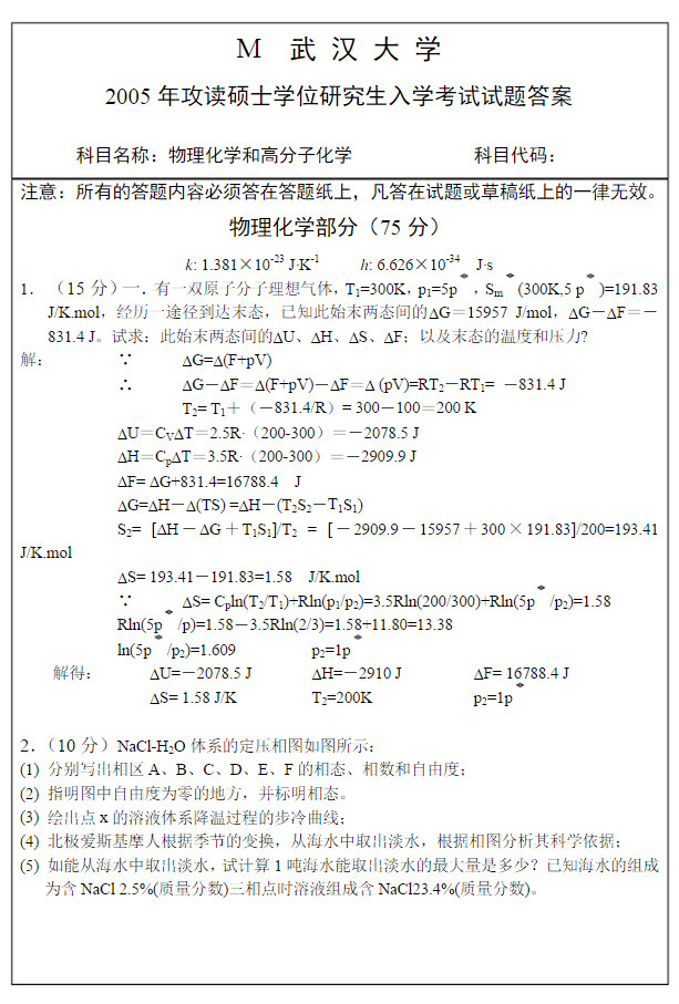 武汉大学2005高分子化学与物理化学考研试题答案