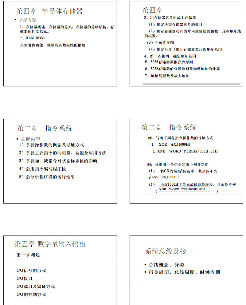微机原理接口技术 一、简答题(每题10分,共50) 1、在8086/8088系统中ALE信号的作用是怎样的? 2、请简述RS232c的电平标准,正负逻辑分别用什么电平信号表示?至少写出4个rs232的常用信号并加以解释。 3、简述可屏蔽中断的响应和执行的过程。 4、I/O端口的定义。I/O接口有哪几种类型,请简要描述。 5、描述8237DMA控制器的地址双向的作用情况。 二、程序题(第一题10分,后面两题每题15分)(具体题目没有记下来,但是基本书上都能找到的那种,我只说一下大概) 1、 DATA1DB300DUP(?) DATA2DB100DUP(?) LEABX,DATA1 LEADX,DATA2 MOVSI,0 MOVDI,0 MOVCL,100 LOOPER:MOVAL,200[BX]SI MOV[DX]DI,AL INCSI INCDI DECCL JNZLOOPE ...