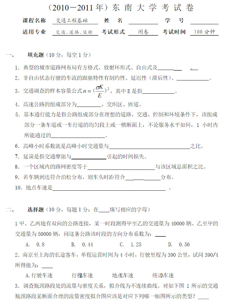 2010-2011年东南大学交通工程学期末考试试题(A 试卷)
