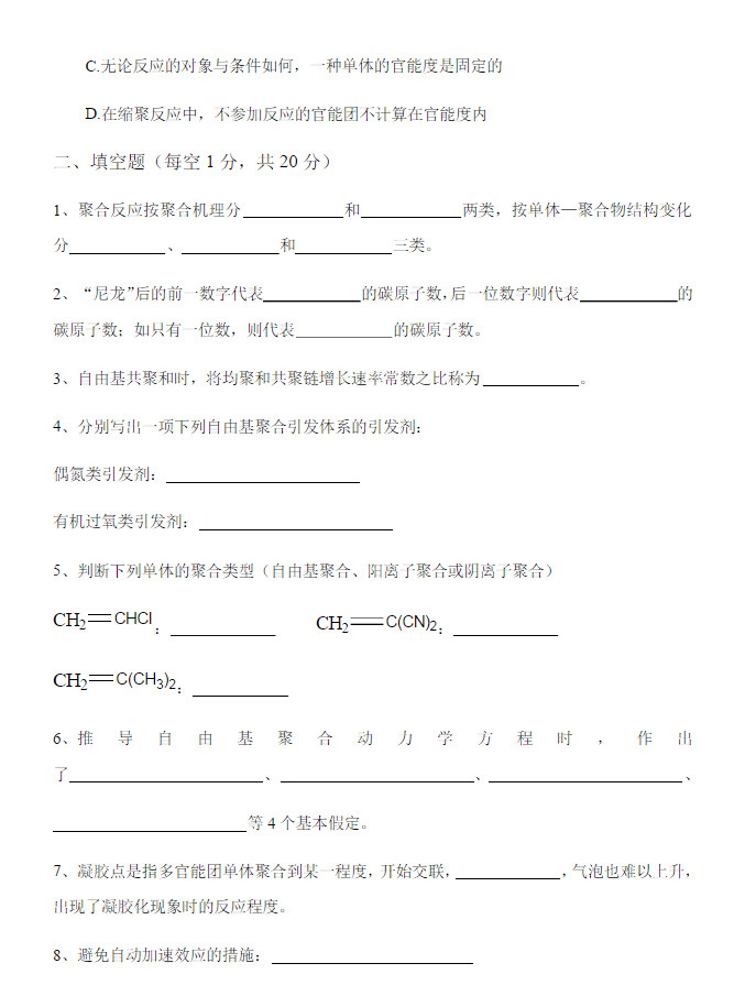 一. 下列烯类单体适于何种机理聚合:自由基,阳离子或阴离子聚合?并简要说明理由。(20分)