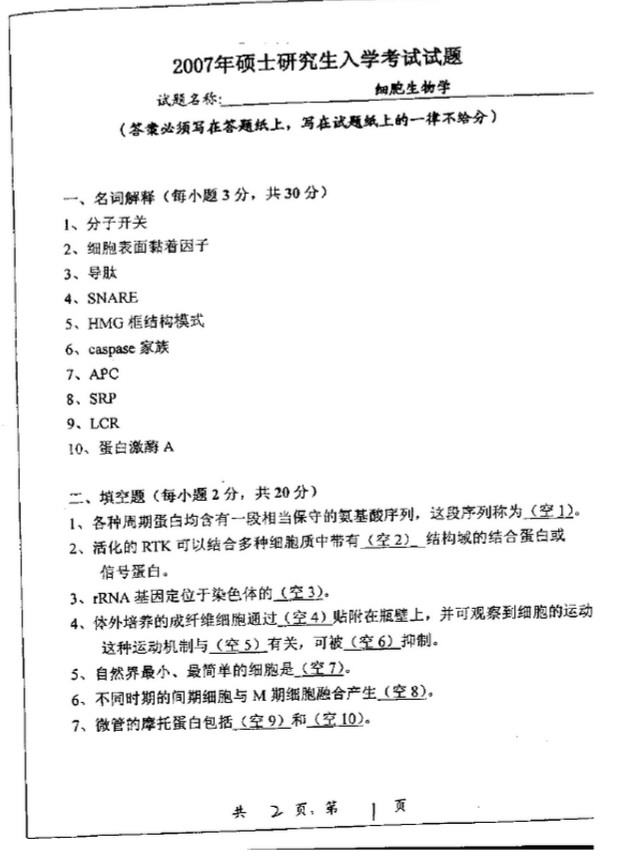 兰州大学2007年细胞生物学考研真题