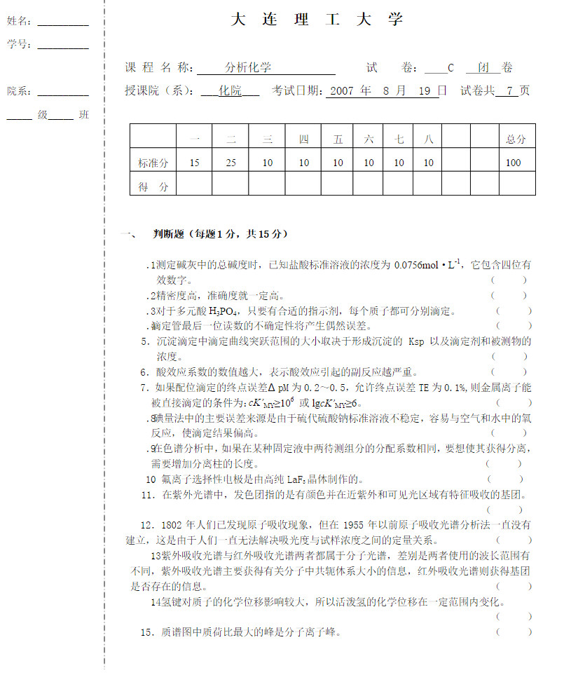大连理工大学2007分析化学C期末试卷带答案