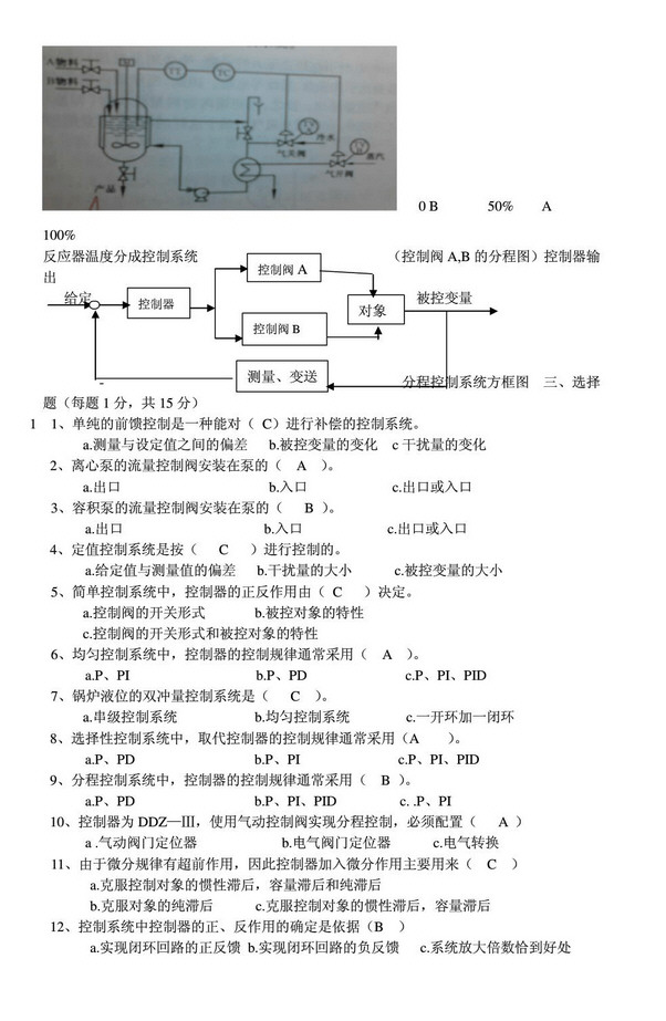 第1章 绪论 一、选择填空题 1.开环控制系统在其控制器和被控对象间只有(正向作用)。P2 A.反馈作用 B.前馈作用 C.正向作用 D.反向作用 2.闭环控制系统的主反馈取自(被控对象输出端)。P3 A.给定输入端 B.干扰输入端 C.控制器输出端 D.系统输出端 3.闭环系统在其控制器和被控对象之间有( ...