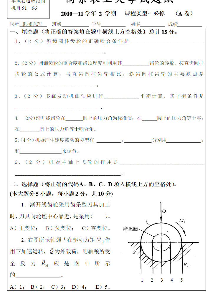 南京农业大学2010—11学年 2 学期机械原理试卷