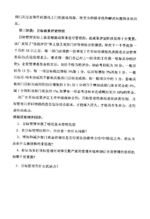 2011年山西财经大学管理学(802)试题 一、名词解释(每小题5分,共30分) 1霍桑试验 2流程再造 3目标管理 4决策 5组织文化 6激励 二、简答题(每小题10分,共50分) 1科学管理理论的主要内容是什么? 2组织设计应考虑那些因素? 3影响有效沟通的因素有那些? 4领导与管理是什么关系? 5控制过程的基本环节有那些? ...